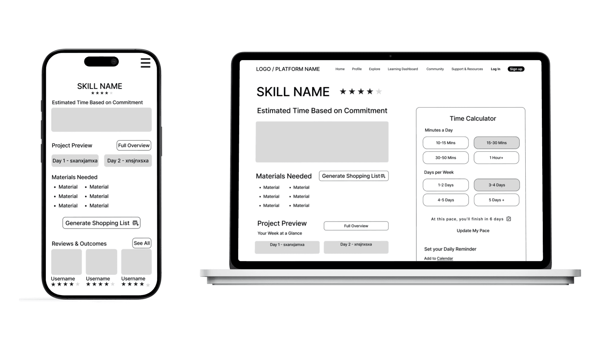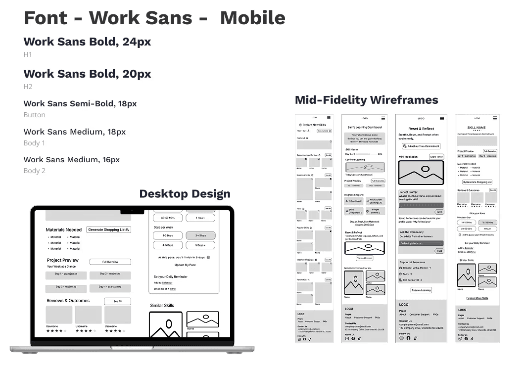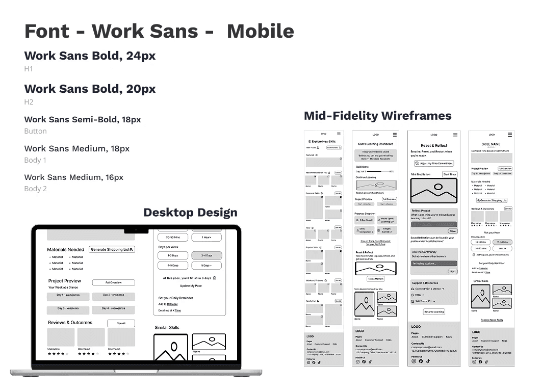 The final Skill Collective screens support a range of users, from busy professionals, hobbyists, to retirees, by clearly surfacing expectations, time commitments, materials, and next steps up front. By reducing uncertainty, the platform helps learners focus on steady progress rather than second-guessing where and how to begin and keep going.