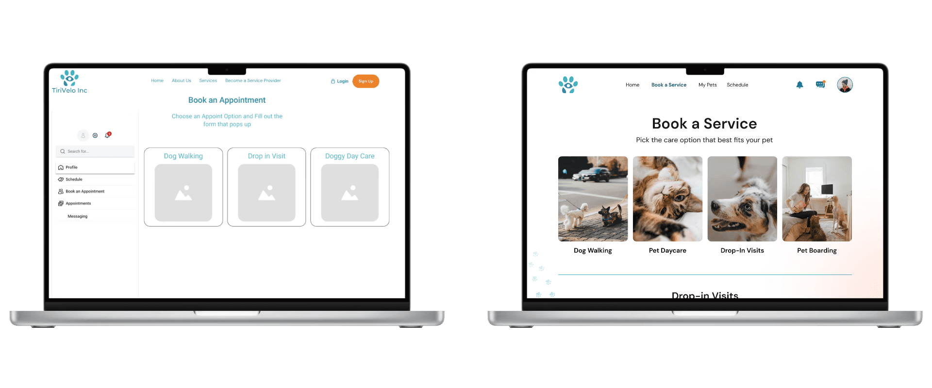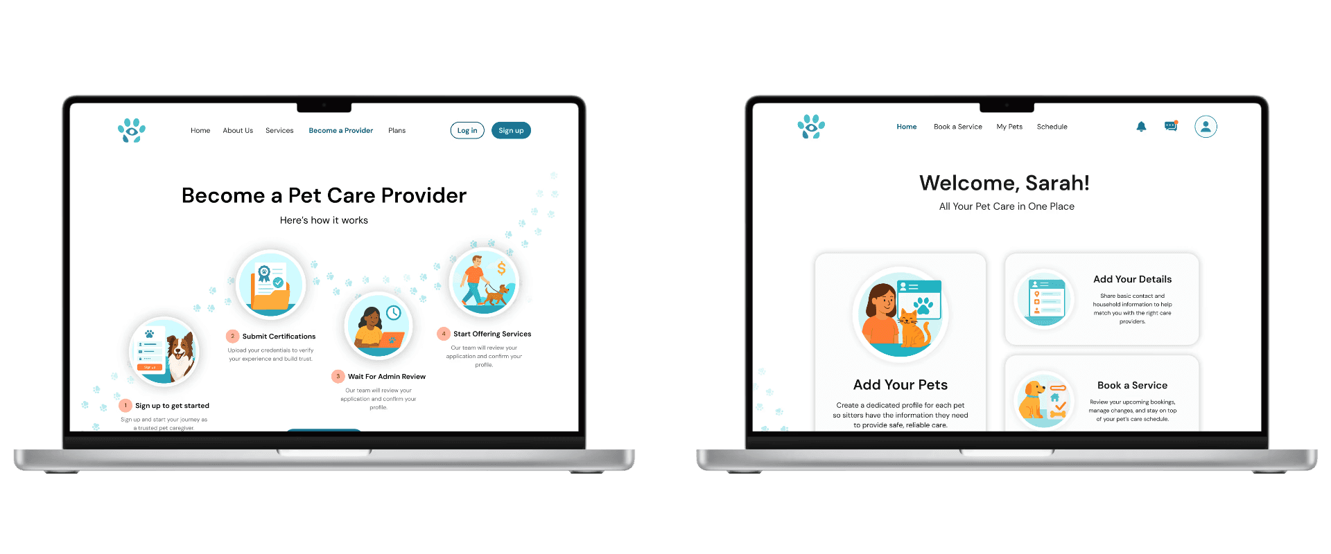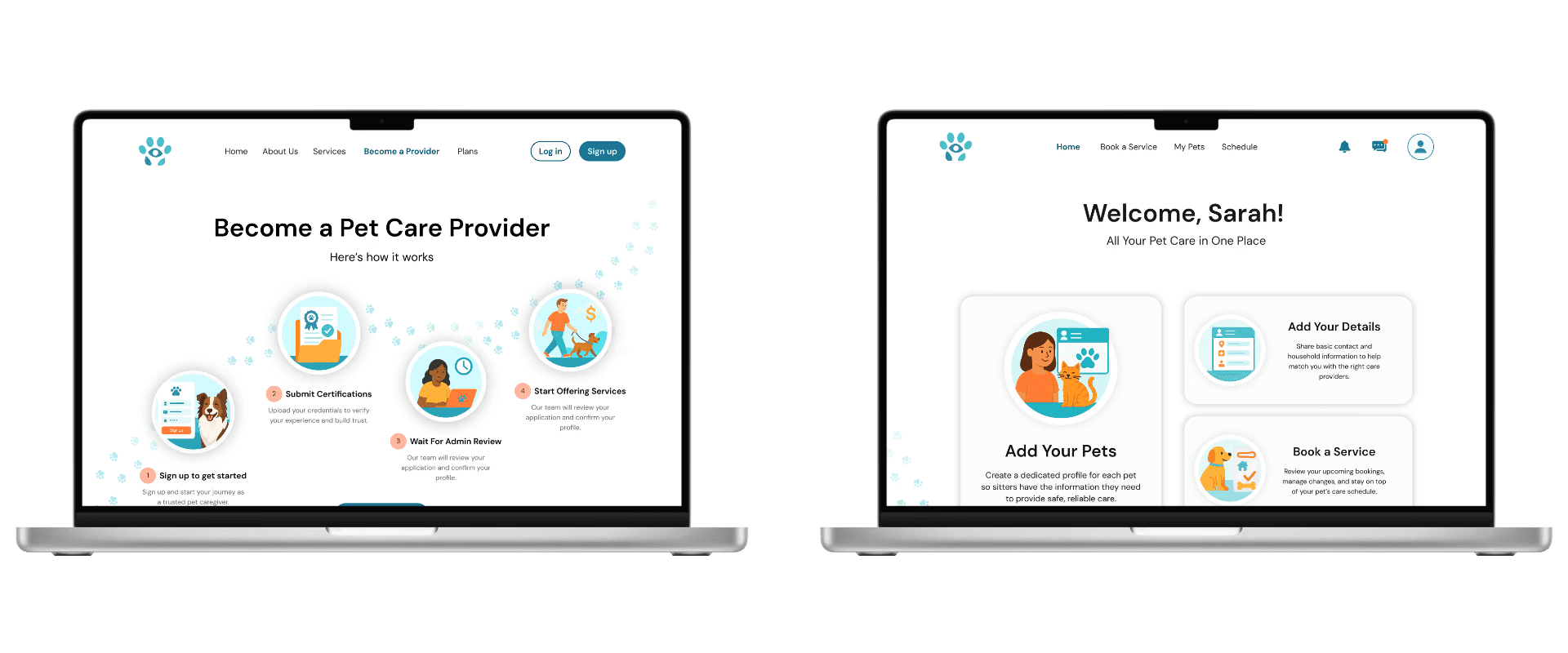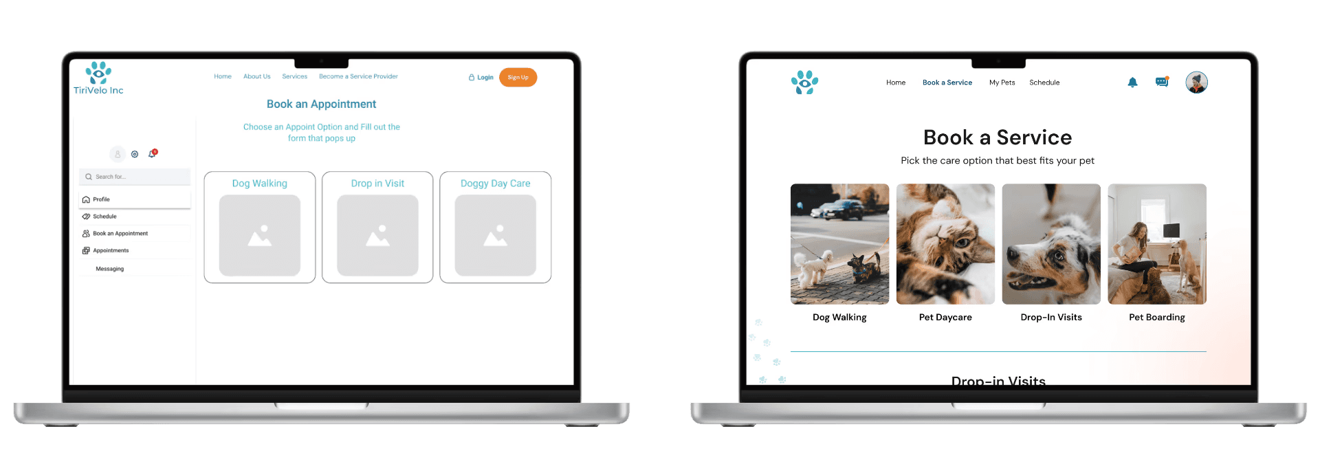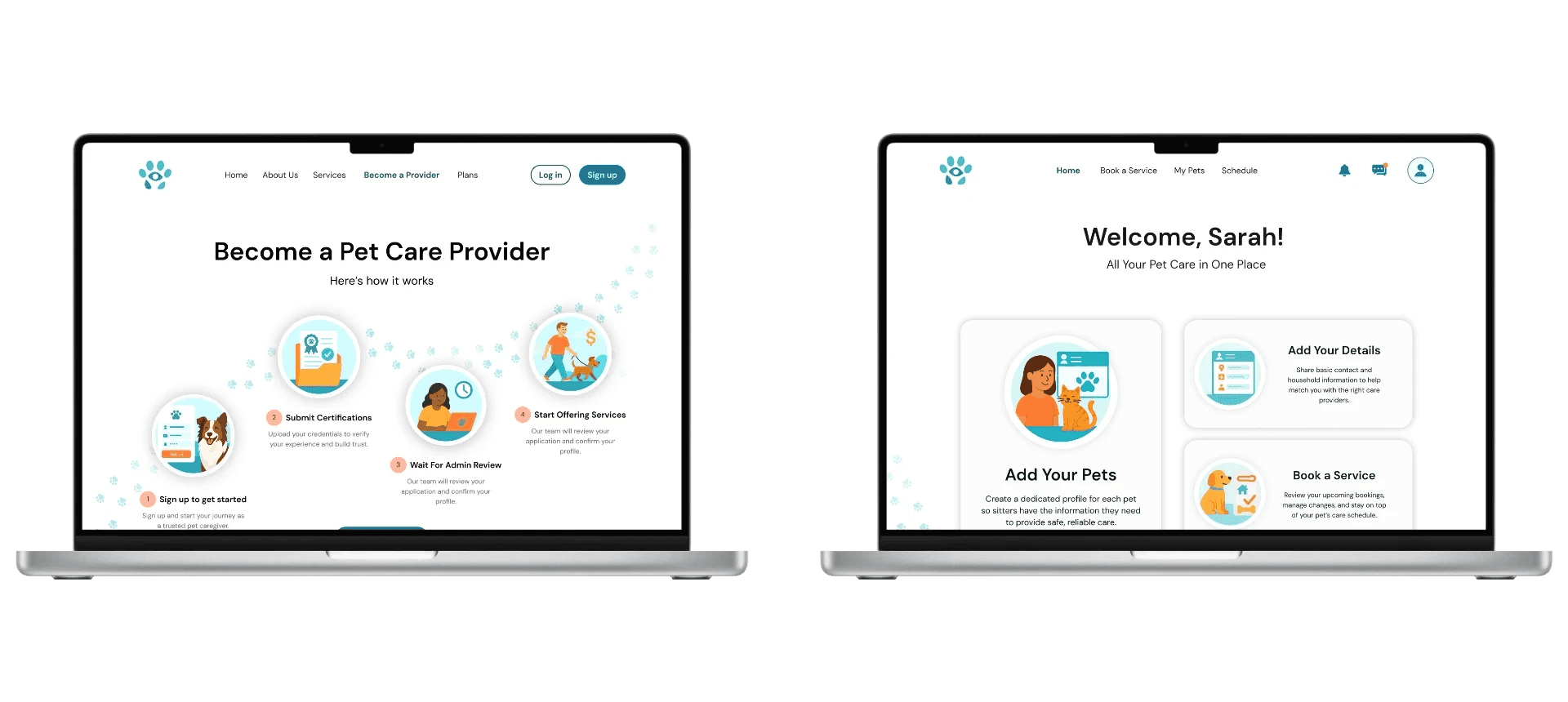 To resolve this, the first-time landing experience was restructured to reflect users’ mental model. Instead of showing an empty schedule, the updated layout introduces a clear “Add Your Details” card alongside “Add Pet Details,” followed by “Book a Service.” This sequence reinforces that both human and pet information are required before scheduling care, while reserving the schedule view for returning users.