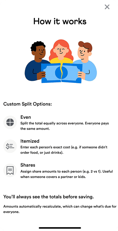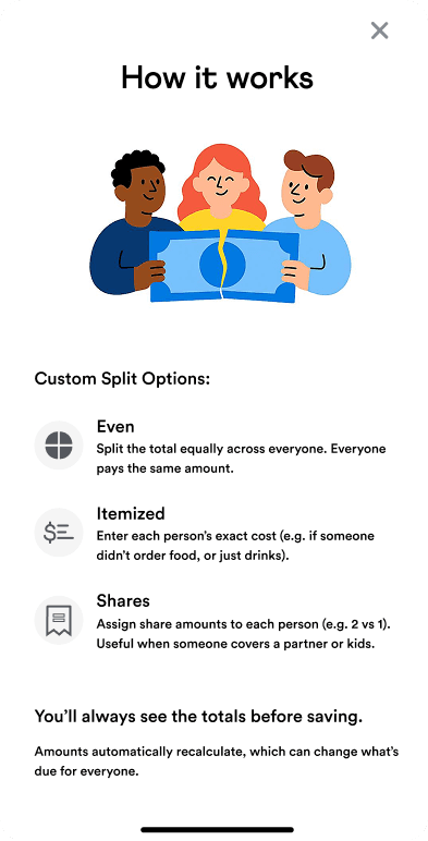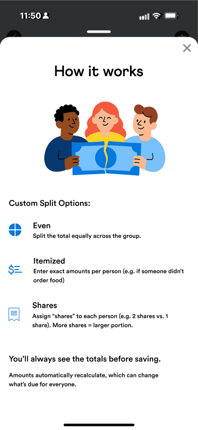To address confusion without overwhelming users, I designed a lightweight “How It Works” overlay. It explained each split type with simple examples, matched Venmo’s existing help patterns, and stayed optional and dismissible.