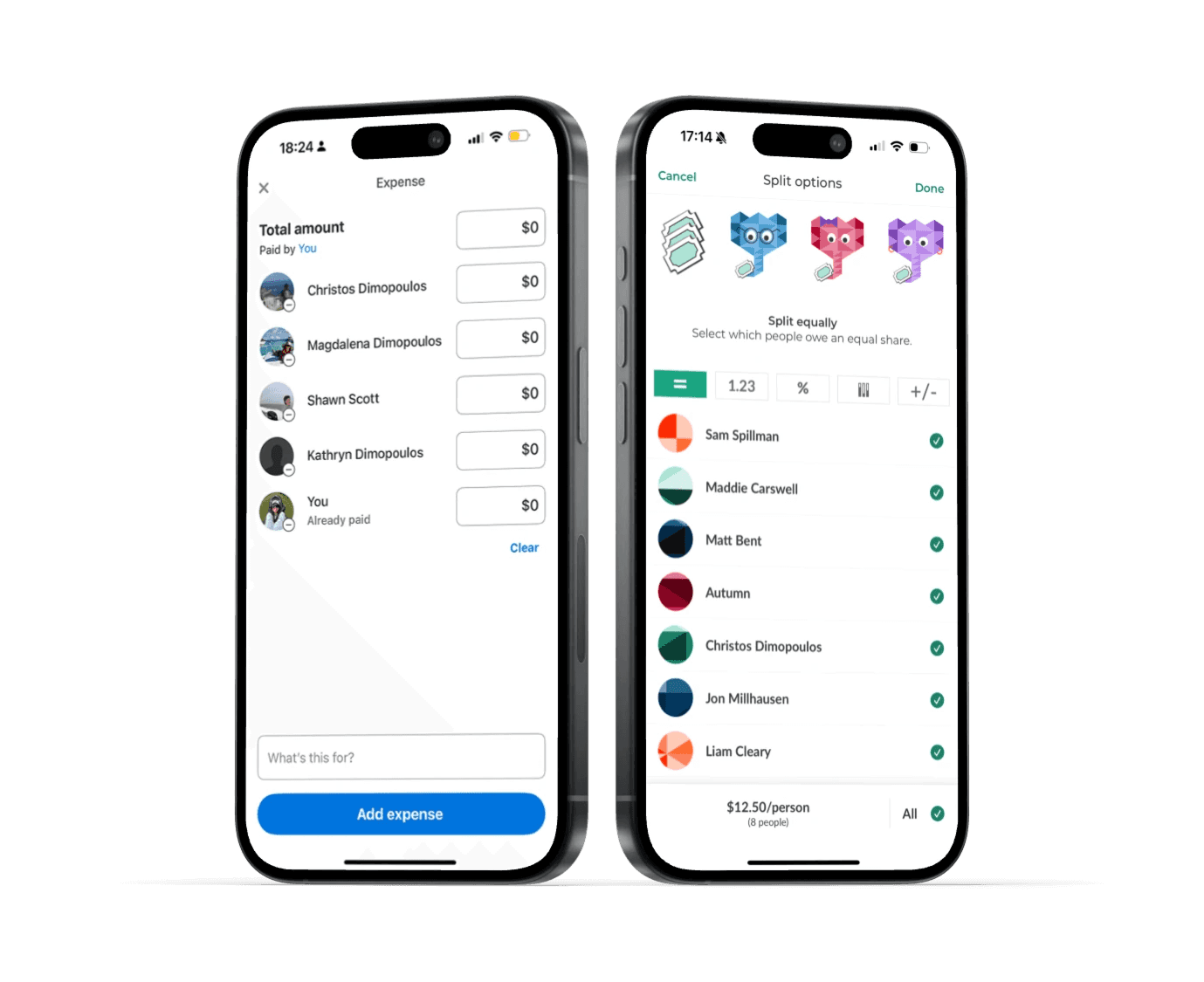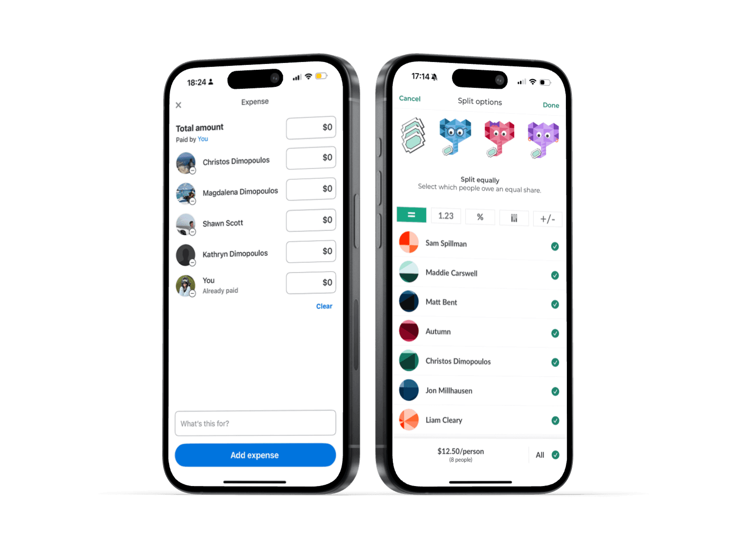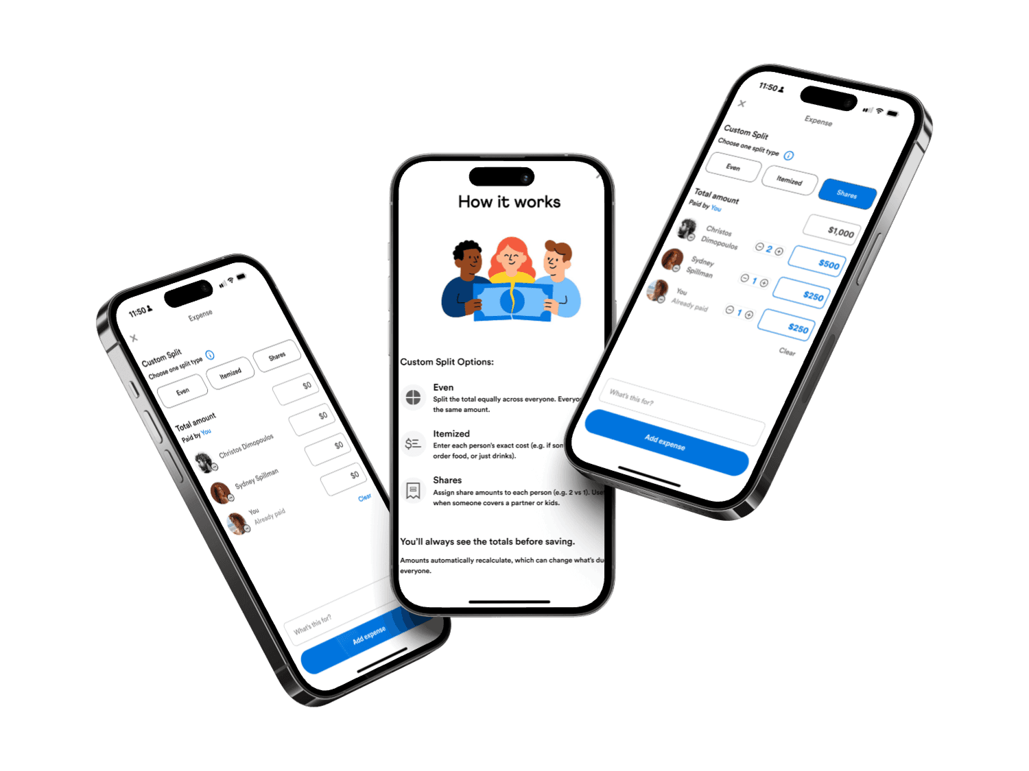 Compared split controls (even, custom, shares) to reduce setup time and clarify who owes what
