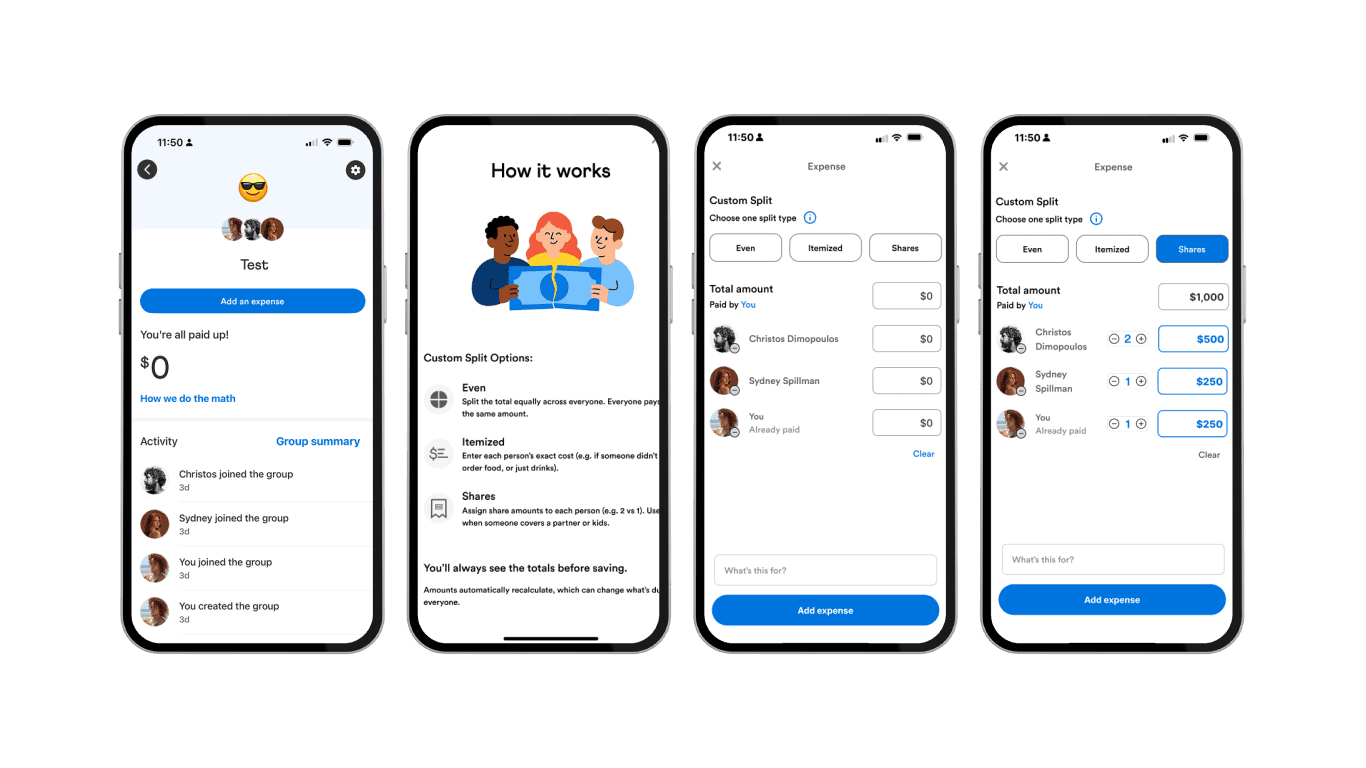 Multiple split types within the Groups page, keeping patterns consistent with Venmo’s existing layout