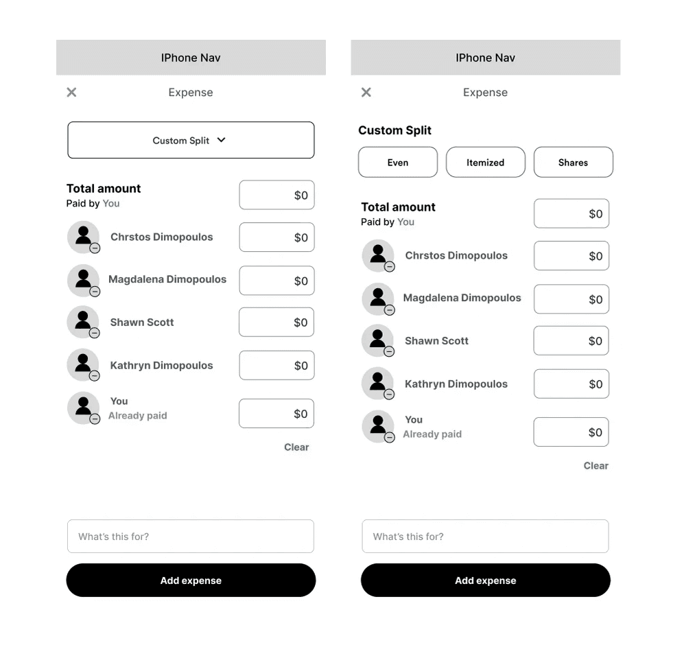 I explored different ways to surface split options and group context, including dropdowns and chip selectors, before moving into mid-fidelity wireframes.