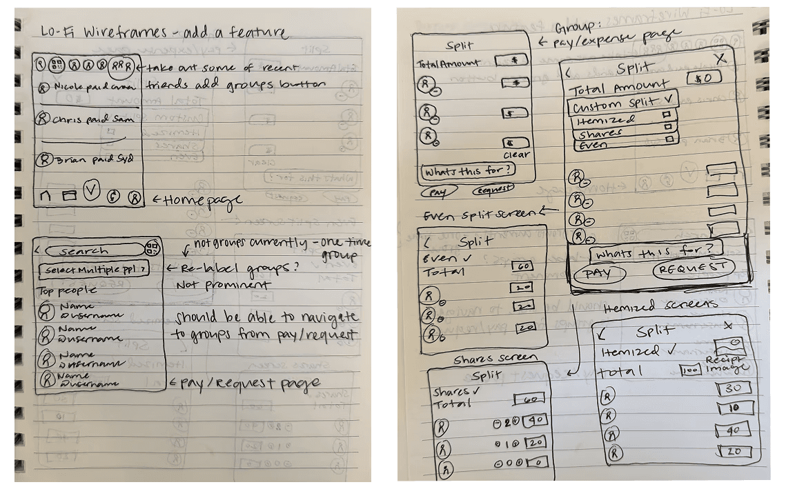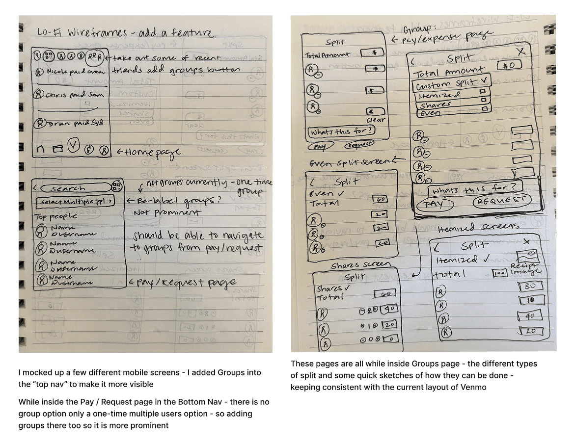 I began by sketching multiple flows that stayed true to Venmo’s minimal, friendly interface. My focus was balancing flexibility with clarity — supporting uneven splits without requiring users to do mental math.